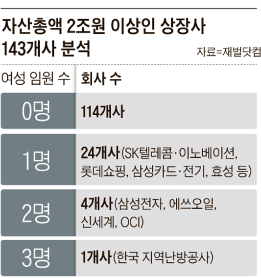 - 자산 2조원 이상 상장사 여성 이사 의무화,114개 기업 비상,상장사 143곳중 80% 여성 등기임원 0명,2022년 7월까지 1명이상 구해야재계 "기업이 알아서 할 일을 ,친정부 여성임원 모셔야 하나"기업분석 사이트 재벌닷컴은 19일 "지난해 정기주주총회 당시 제출한 임원 명부 기준으로 자산총액이 2조원 이상 상장기업 143곳중 79.7%인 114곳은 여성 등기임원이 0명"이라고 밝혔다.이 기업들은 늦어도 2022년 7월까지 여성 등기이사를 적어도 1명 확보해야 한다. 지키지 않는 기업에 대...
