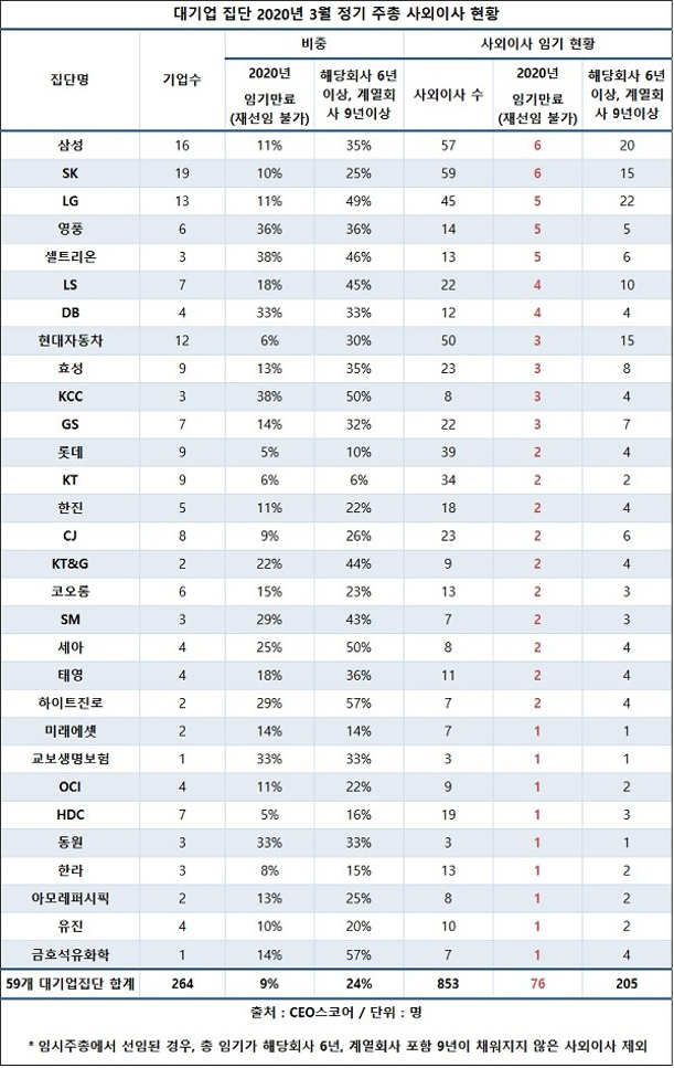 - 정부가 21일 국무회의에서, '한 회사에서 6년 이상,계열사를 포함해 9년이상 재직한 사외이사는 같은 회사 사외이사를 맡을 수 없다'는 상법 시행령 개정안을 의결 하면서, 대기업들은 오는 3월 정기주총에서 명망있고 신뢰할 수 있는 사외이사 확보에 비상이 걸렸다.21일 기업평가사이트 CEO 스코어가 59개 대기업집단 264개 상장사 사외이사 853명의 재임기간을 조사한 결과,올 3월 주총에서 재선임이 불가한 사외이사는 총 76명으로 집계되었다.2022년 임기...