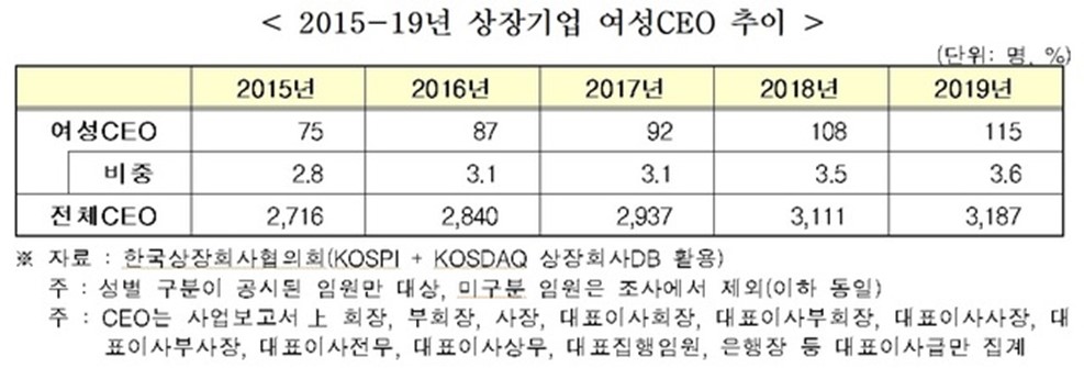 - 상장기업 여성 CEO 2019년 비중 전체 3.6%...