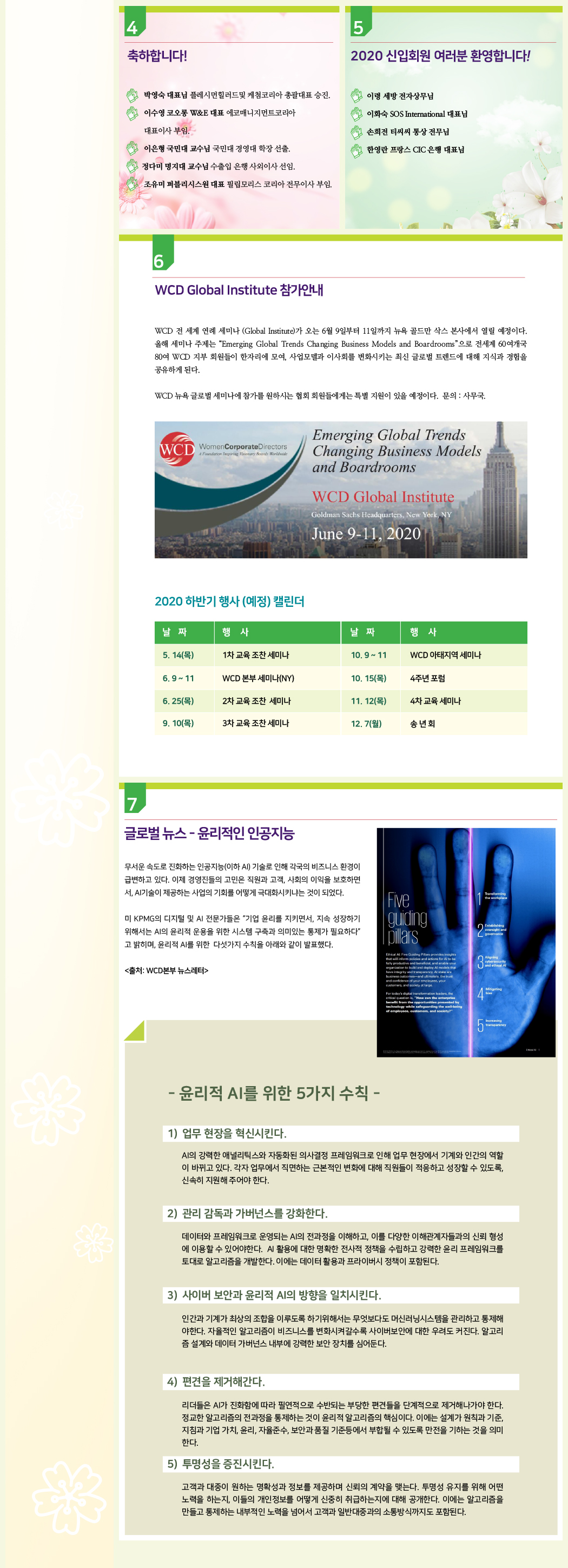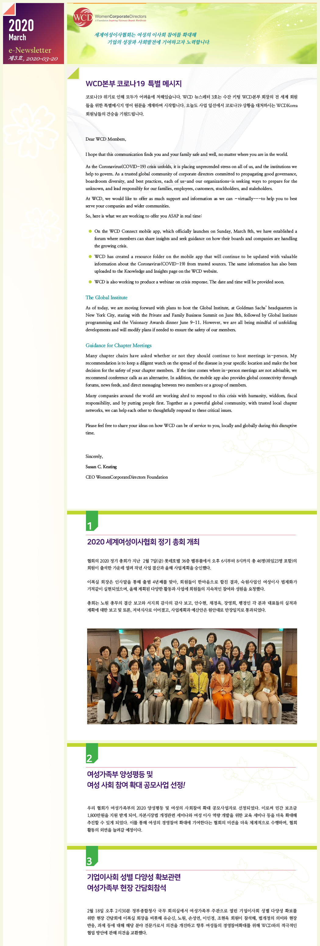 WCD e-Newsletter는 세계여성이사협회의 주요활동소식과 회원동정을 분기별로 정리해 공유해 드리는 소식지입니다.