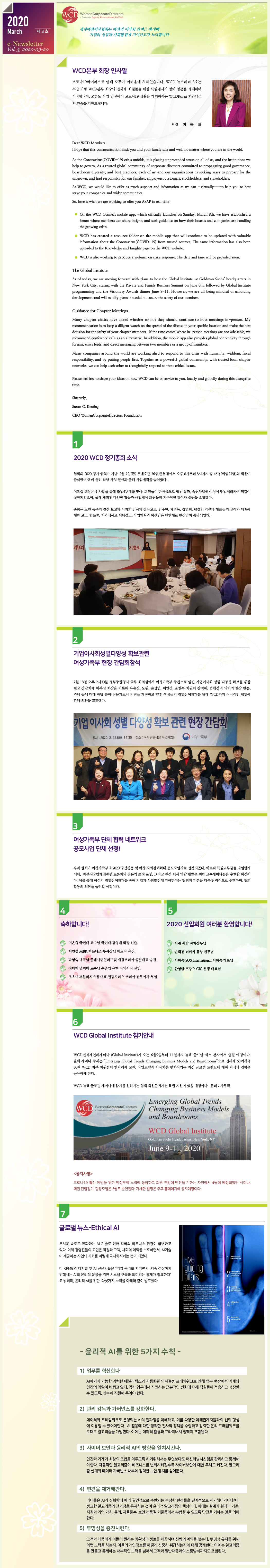 WCD e-Newsletter는 세계여성이사협회의 주요활동소식과 회원동정을 분기별로 정리해 공유해 드리는 소식지입니다.