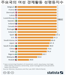 - 세계은행 ,전세계 여성의 경제적 권리 비교,190개국 평균치는 남성의 4분의 3 수준(76.1점)('2021 여성의 일과 법' 보고서)한국은 85점으로 세계 평균보다 9점이 높지만 OECD평균 95점 보단 10점이 낮은 상태,특히 임금지표가 취약 기사출처 : 한겨레 2020.03.08 곽노필 선임기자기사링크 : http://www.hani.co.kr/arti/science/future/985828.html?_fr=mt6원문보기 : http://www.hani.co.kr/art...